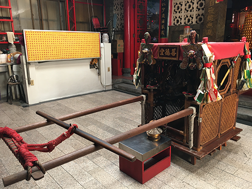 善德堂問事為四人抬轎,以轎旁之黃底文字版,以點字方式回答