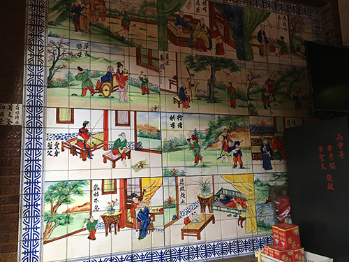 以二十四孝為主題的釉料彩燒磁磚拼貼,為現今逐漸消失的廟宇建築裝飾技藝(王語羚拍攝,2020)